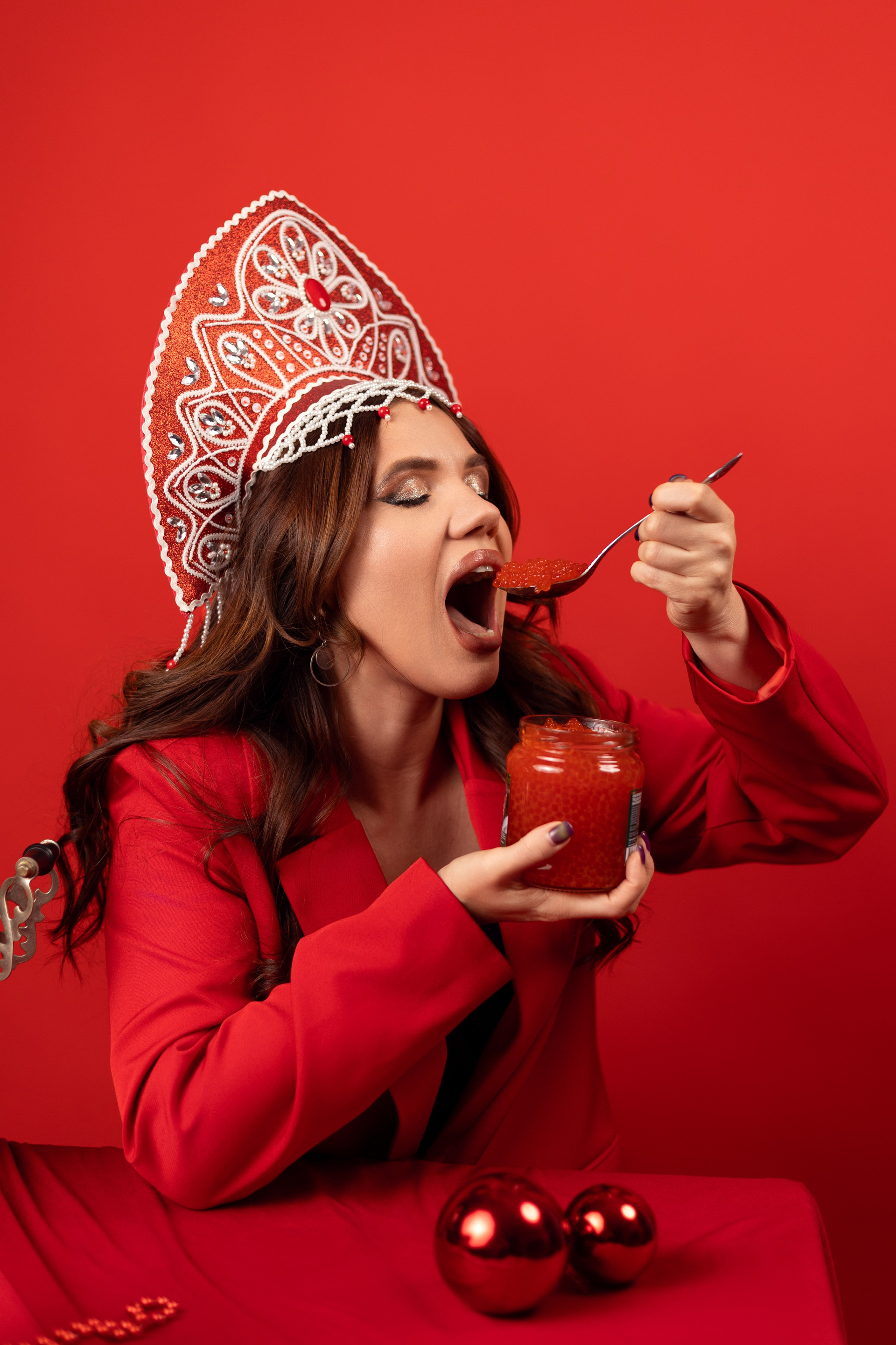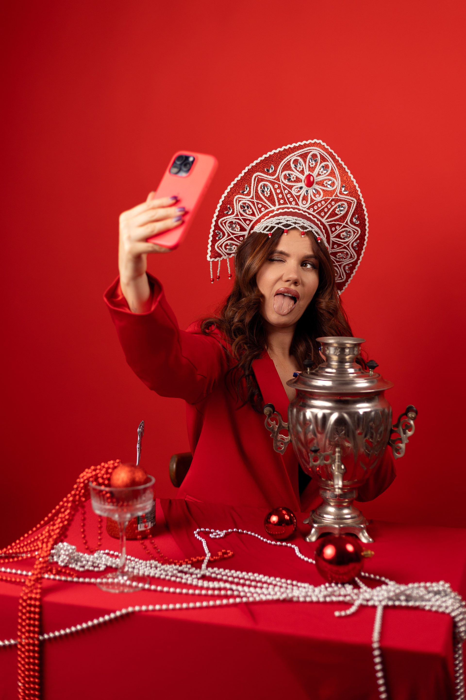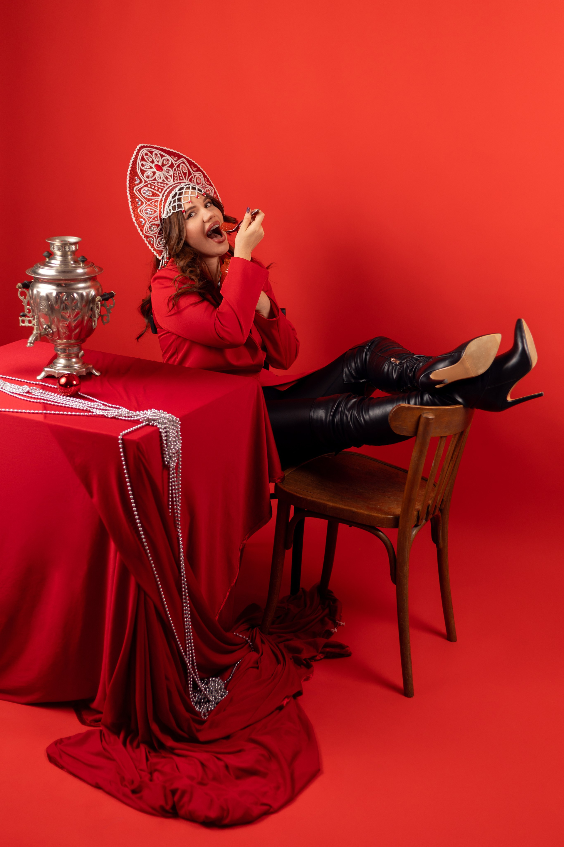 - Реквизит и стиль: Кокошник, красный пиджак, самовар, икра и посуда в стиле хохлома.